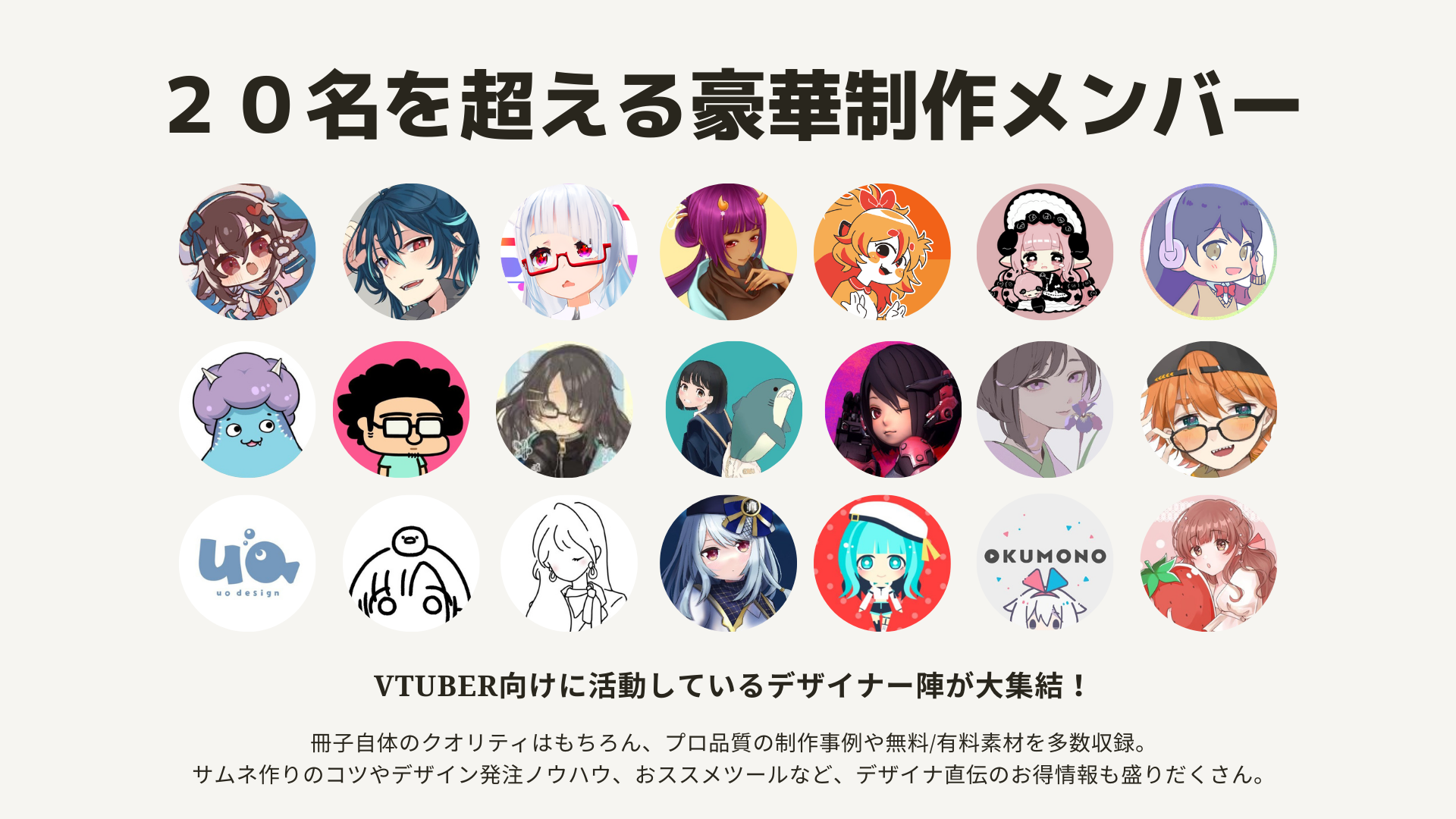商業分野も含め、VTuberのロゴや配信レイアウトの制作を請け負っているデザイナー18名が参加。デビュー準備中や活動中でクオリティーを高めたいVTuberに向け、キャラクターデザイン、ロゴ、配信レイアウト、サムネイルなどの作例や無料素材を収録する。背景やテンプレート等の素材も、サンプルとダウンロードリンクも誌内にまとめる。