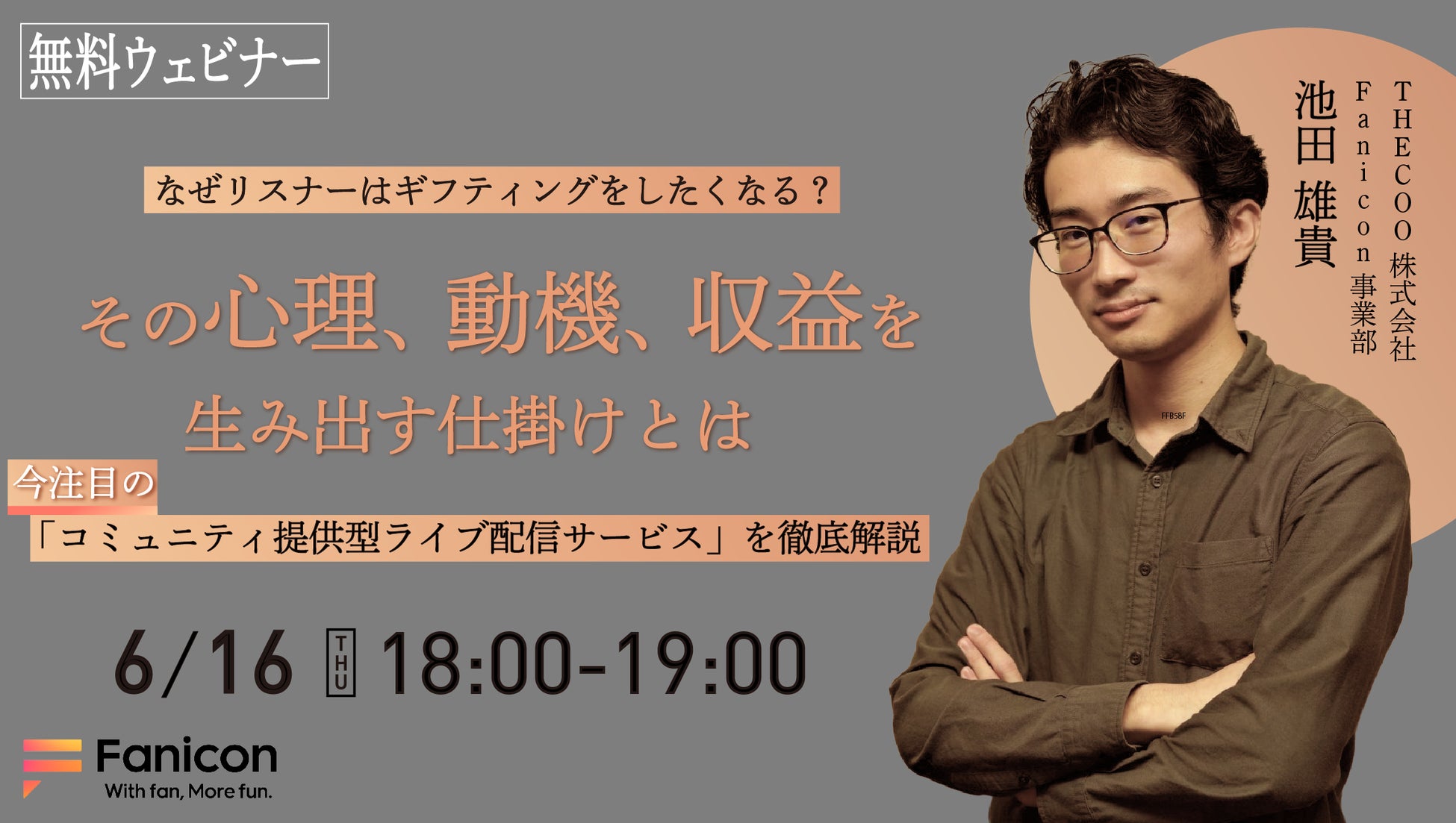 会員制ファンコミュニティプラットフォーム『Fanicon』を運営するTHECOO株式会社(本社:東京都渋谷区、代表取締役CEO:平良真人、証券コード:4255)は、2022年6月16日(木)18:00〜19:00にてエンタメ業界関係者に向けた無料ウェビナー「なぜリスナーはギフティングをしたくなる?その心理、動機、収益を生み出す仕掛けとは 今注目のコミュニティ提供型ライブ配信サービス」を開催いたします。
