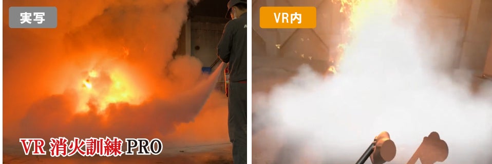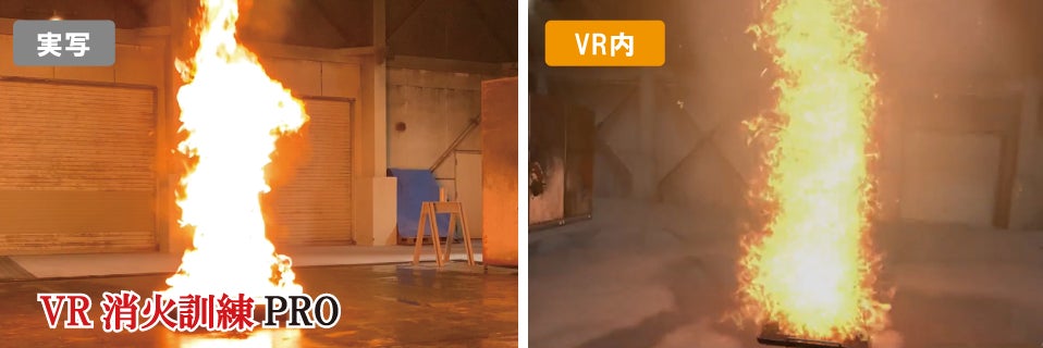 実際に消火訓練で行う油火災の現場をVR内で再現し、火炎や消火薬剤の噴射表現と消火器を使うときの注意事項を消火器メーカーの技術職員監修のもと開発しました。消火薬剤の噴射音や火炎の音も消火実験施設で録音したものを使用しており、実際の消火訓練に近い消火体験が可能です。