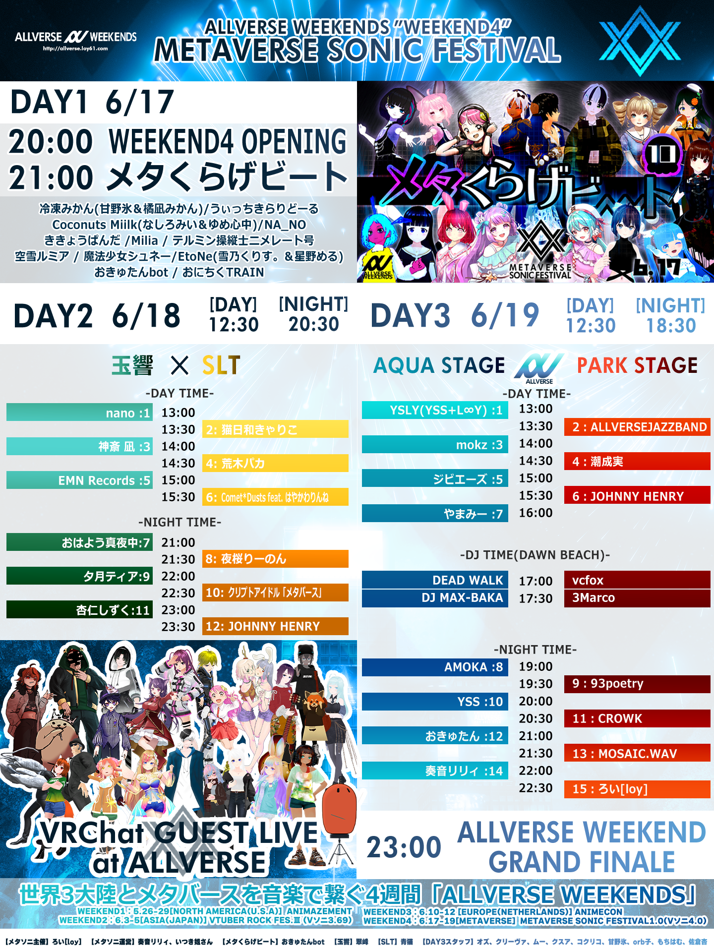 ALLVERSE WEEKENDSは、アメリカ、ヨーロッパ(オランダ)、日本(アジア)という3つの場所で行われているコンベンションやフェスをメタバースを通じて音楽でつなぐというプロジェクト。