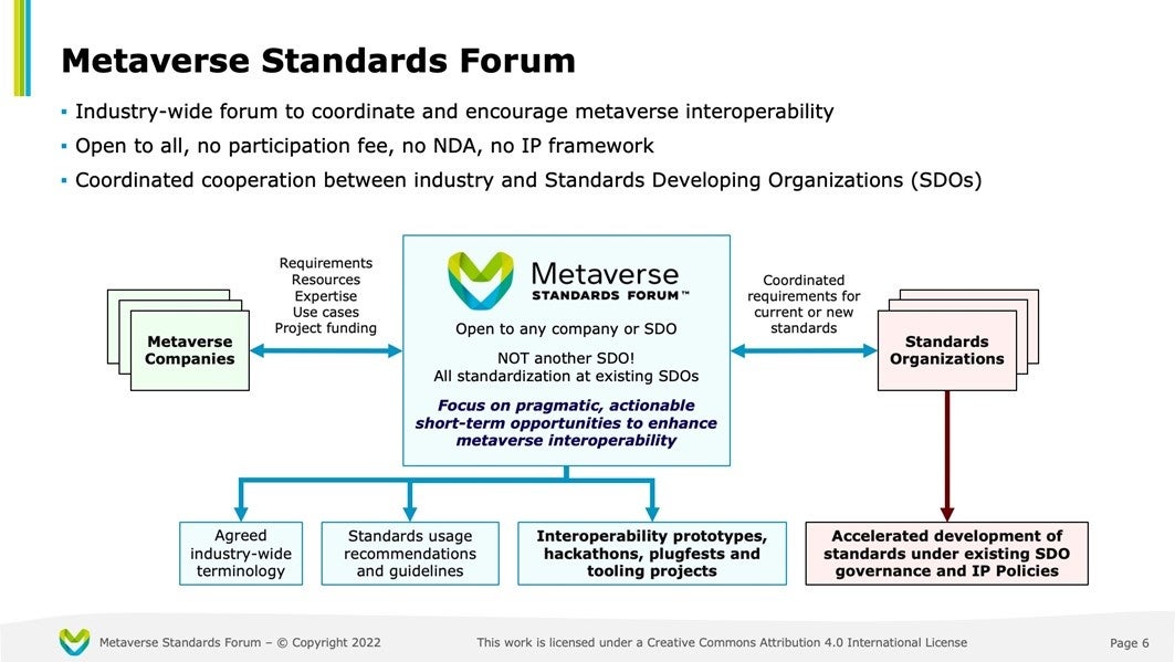 Metaverse Standards Forumは、オープンで包括的なメタバースのための相互運用性標準の開発を促進し、実用的でアクションベースのプロジェクトを通じてその開発と展開を加速するために、標準化団体と企業間の協力の場を提供しています。