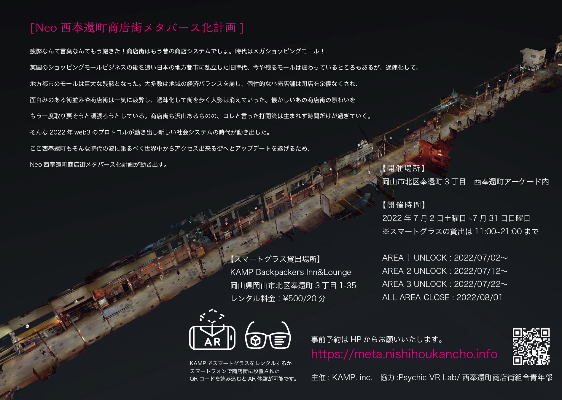 岡山市北区の西奉還町商店街で、宿泊施設「KAMP(キャンプ)」による、新しいかたちのまちイベント「Neo 西奉還町商店街メタバース化計画 Phase 1」が実施されます。期間は7月2日から1ヶ月。専用グラスやスマホをつかって、様々なARコンテンツが体験できるイベントです。 WHJAPAN株式会社(本社:大阪市)の子会社で、岡山市を中心にアウトドアフェスや宿泊施設の運営や「まち」の活性化イベントを手掛けてきた株式会社KAMP.(本社:岡山市)では、本年7月より、新たにAR/VRを活用したメタバース事業をスタートします。