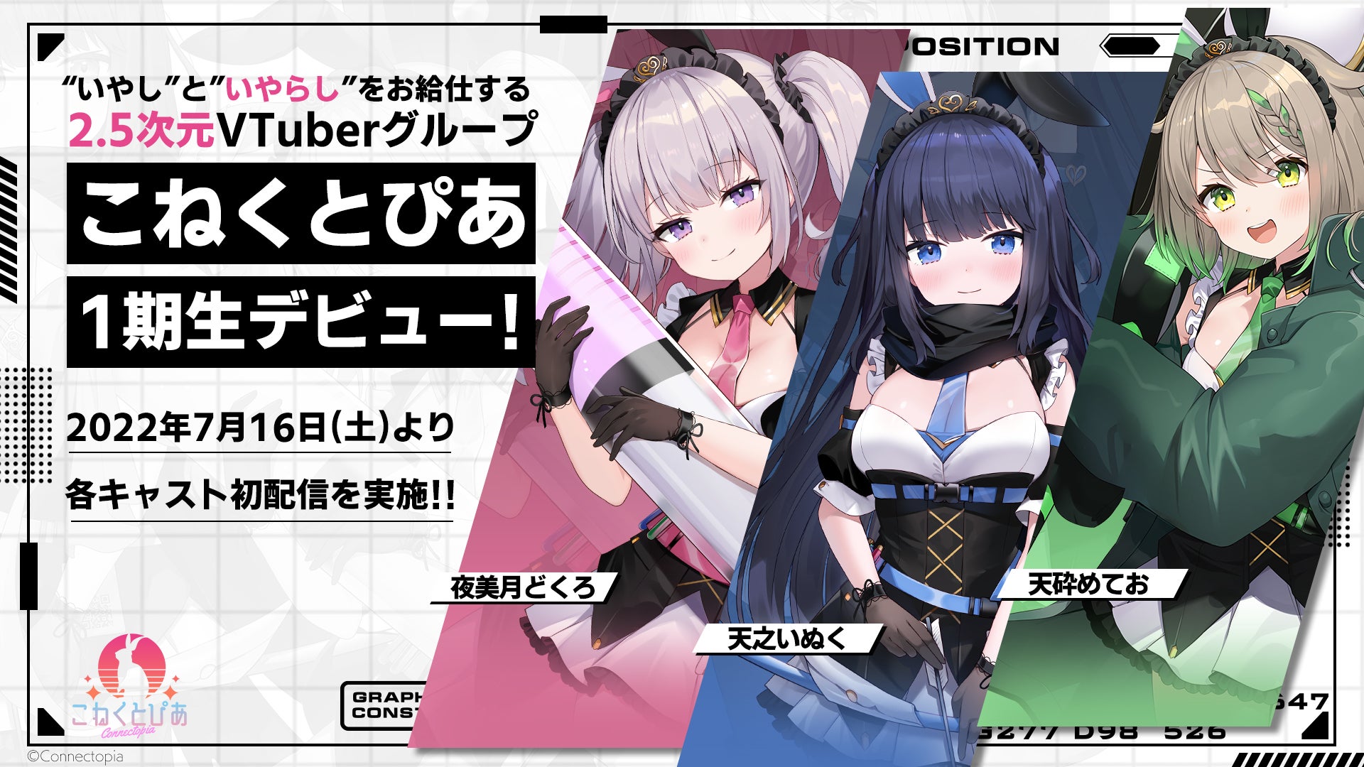 株式会社TAKE1(本社:東京都新宿区、代表取締役:松田純治)は、この度、2.5次元VTuberグループ『こねくとぴあ』を新設し、1期生となる「夜美月どくろ」「天之いぬく」「天砕めてお」のキャスト3名が7月9日(土)よりデビューすることをお知らせいたします。