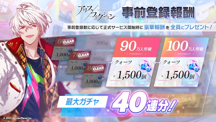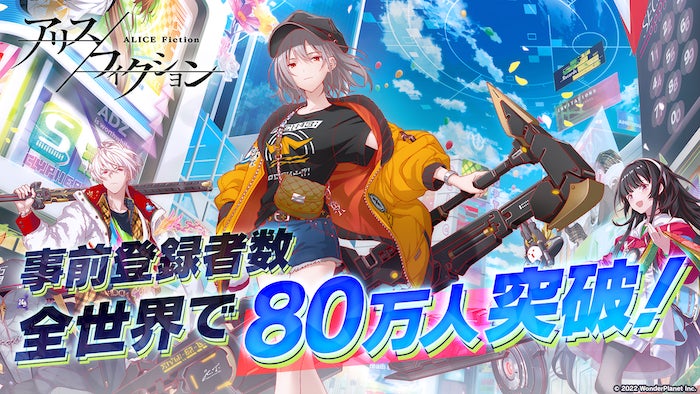 エンターテインメントサービス事業を行うワンダープラネット株式会社(本社:愛知県名古屋市、代表取締役社長CEO:常川友樹、東証グロース:証券コード4199、以下当社)は、今夏全世界同時配信リリース予定の新作スマートフォン向けゲーム『アリスフィクション』の事前登録者数が、全世界で80万人を突破したことをお知らせいたします。