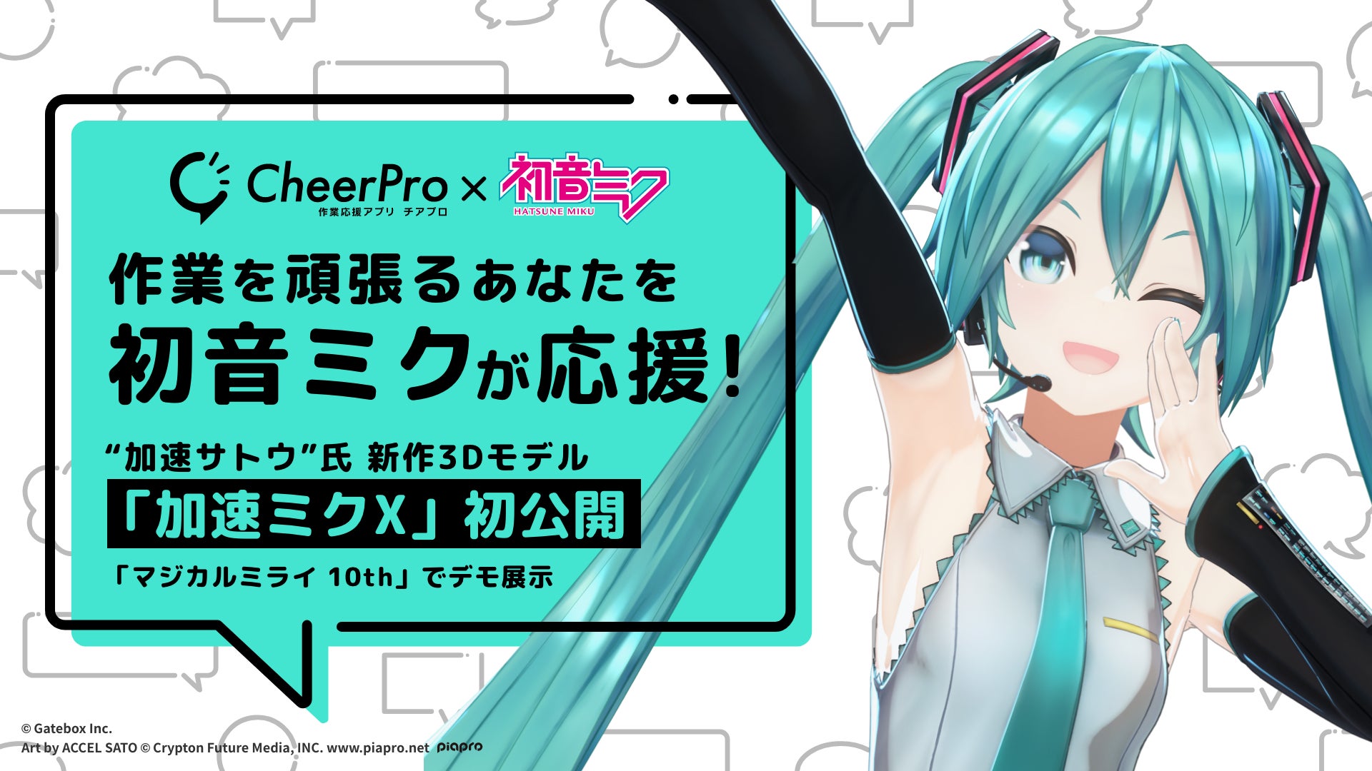 Gatebox株式会社(東京都千代田区、代表取締役 武地 実)は、キャラクターが作業を応援してくれる作業応援アプリ「CheerPro(チアプロ)」に追加キャラクターとして登場する「初音ミク」の加速サトウ氏による新作モデル「加速ミクX (カソクミクテン)」を公開しました。さらに、イベント『初音ミク「マジカルミライ」10th Anniversary』(以下「マジカルミライ 10th」)にて開発中のデモ版アプリを展示します。