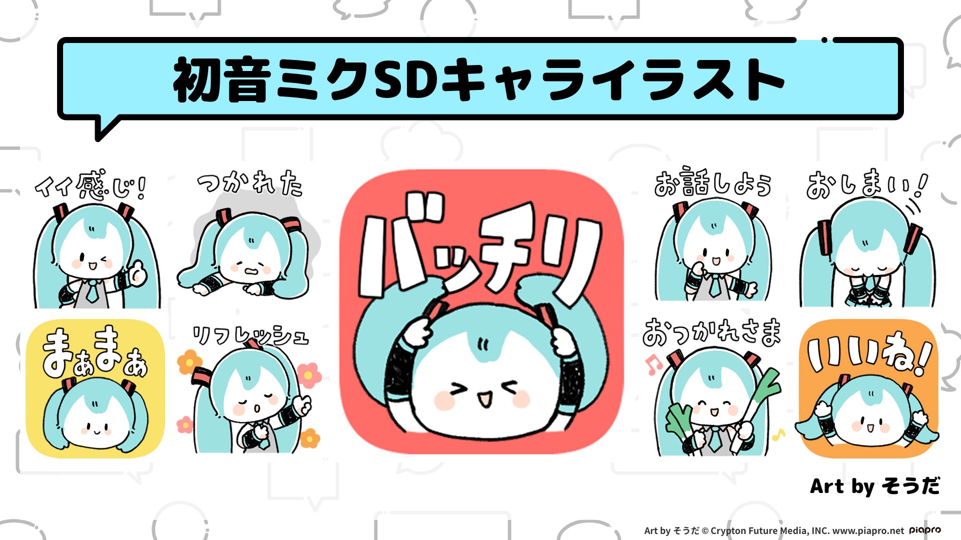 初音ミクのSDキャライラストを、イラストレーターの「そうだ」氏に描いていただきました。イラストはアプリ内で利用するスタンプやアイテムとして登場予定です。詳細情報の公開をご期待ください。