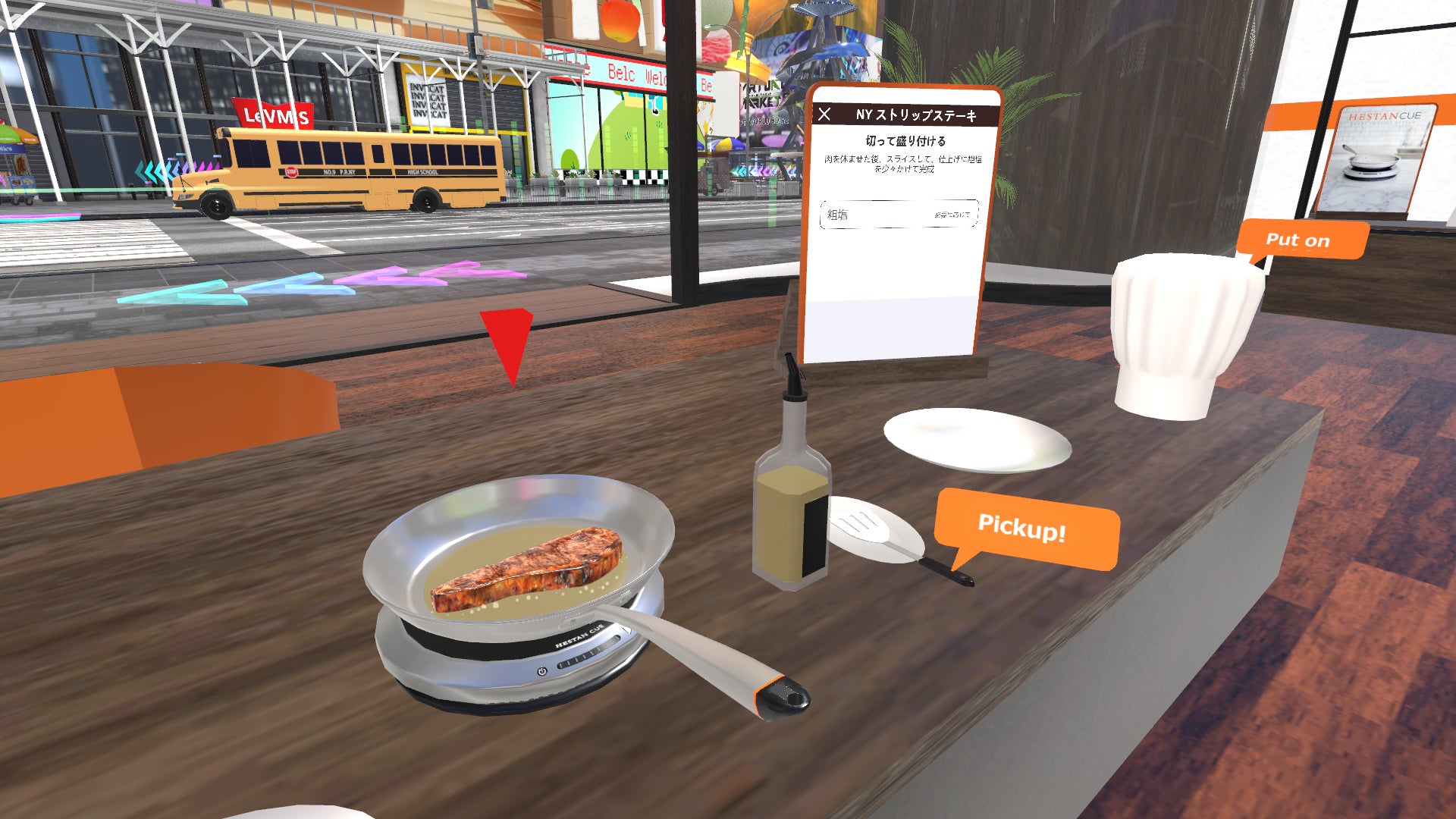 企業出展会場の1つ「パラリアルニューヨーク」に登場する大きなフライパンと回転料理キューブが目印のブース内では、ワイ・ヨットが販売する米国発のスマートキッチン家電「Hestan Cue(へスタン キュー)」を使って、ステーキ、クリスピーサーモン 、パンケーキの3つのレシピのバーチャル料理体験が可能です。パンケーキのレシピでは、チョコペンでのお絵描きも楽しむことができます。さらに各料理の3Dモデルは、ダウンロードして取得することができます。