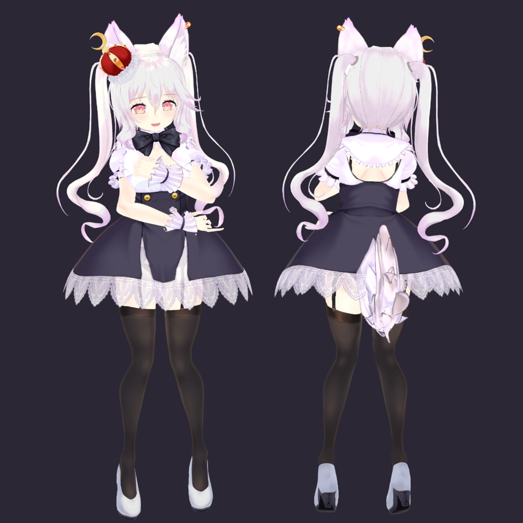狼の女の子のアバターです。ピンク髪に狼耳としっぽ、大きめリボンとレースの透け感がセクシーな衣装という、かわいい要素が盛りだくさんのアバターなので、ケモミミ系の美少女アバターを探している方におすすめです。カラーバリエーション用にPNGファイルが同梱されているため、Unityの操作に慣れている方なら簡単に色改変も可能。