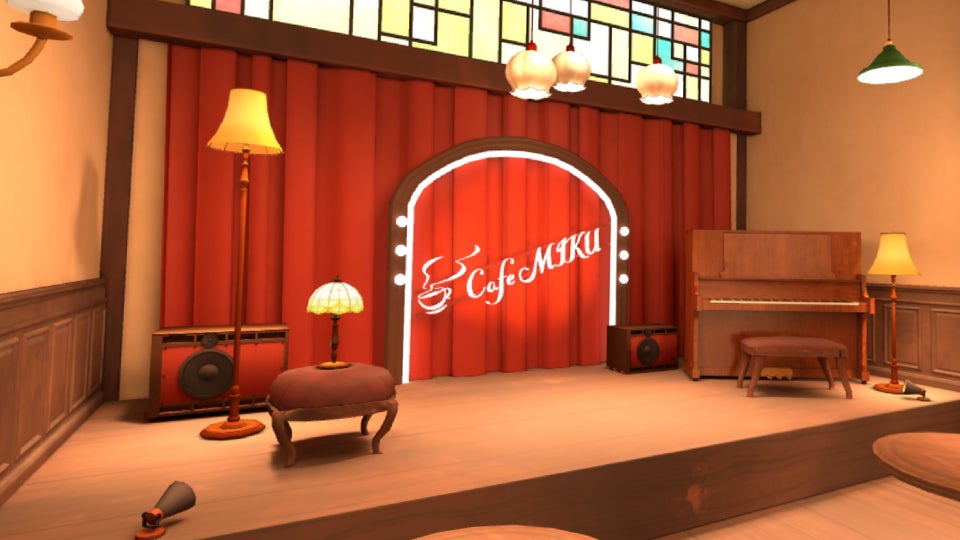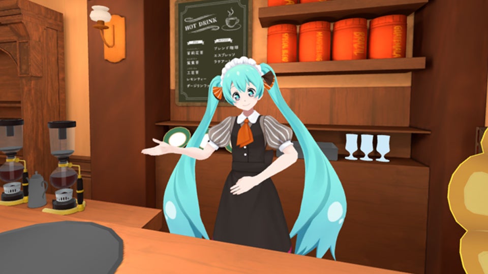 Cafe MIKUは店主初音ミクと一緒に初音ミクの楽曲を楽しめるメタバース空間。お手持ちのPCやスマートフォン、VRデバイスからどなたでも入店できます。店主ミクがあなたの気分に合わせた曲をかけてくれるトークルームもご用意。素敵な時間をお楽しみください。