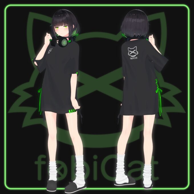 猫耳ゲーミングヘッドフォンをつけた女の子です。オーバーサイズのTシャツと足元が左右長さが揃っていない白ソックスにスリッパを履いているところにダウナーな魅力があります。トクナガさんの屋号であるAtelier Alcaとして共通ボディがあったり、ディスコードサーバーも運用されているなど、アバターを介したコミュニケーションに力を入れているのが特徴的です。
