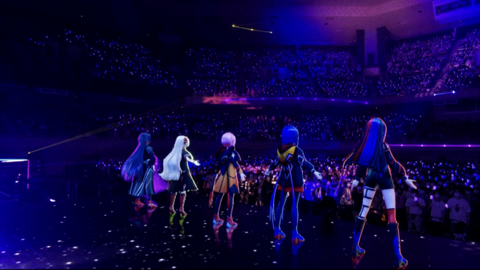 会場で生放送も同時に見ていてわかったのだが、今回、現場と生放送は完全に同じではなく、生放送では一部、AR合成でバーチャルシンガーたちを登場させていた。これにより、会場をそのまま映しただけでは実現できない、下段の光るLED演出の上に立つバーチャルシンガー、その眼前に広がる3階までの広大な客席というカメラアングルなども実現していた。