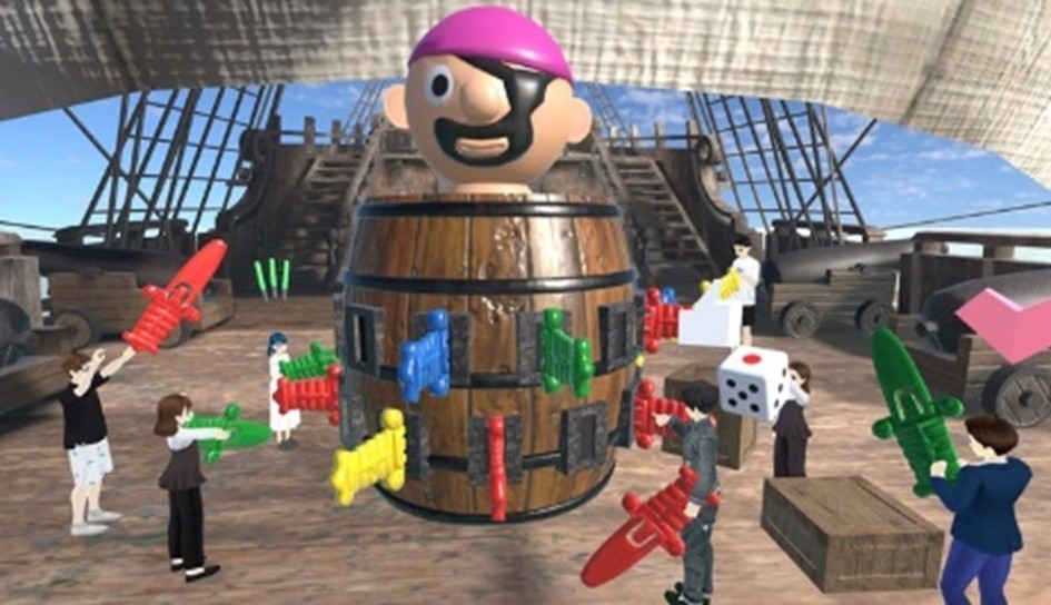 黒ひげ危機一髪は、樽に開いた穴に剣を刺していき、黒ひげくん人形を飛ばした人が負けというパーティーゲーム。これまで身近な人としか遊べないという距離の制約があったところ、メタバース上で展開することで、いつでもどこでも誰とでも楽しめるようになったという。
