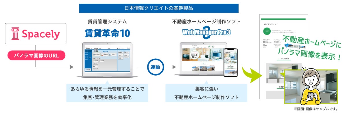 本連携により、VRクラウドソフト「スペースリー」を利用している不動産事業者は、日本情報クリエイトのシステムとURLで連携を行うことで、業者間流通サービスや、不動産会社のホームページにて「スペースリー」を利用したオンライン内見用のパノラマツアーコンテンツの掲載が可能になります。