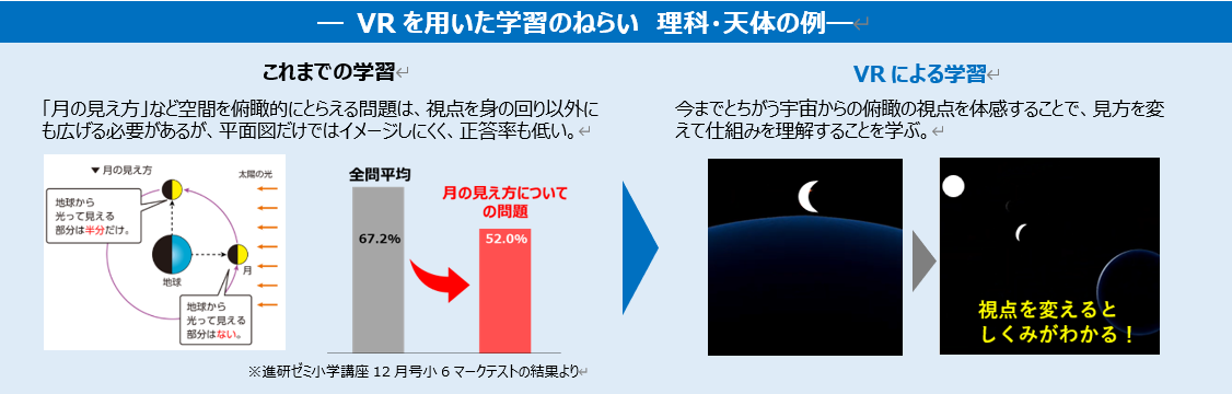この調査結果をふまえて、進研ゼミは、小・中学生(11歳以上対象)の学習専用に独自に開発した「VR studyゴーグル」を使いながら学習する「ハイリコム学習」をスタートします。特に学習内容が大きく変わり、子どもの苦手ができやすい中学校に進学するタイミングに役立ててほしいという想いから、まずは小学6年生向けの<進研ゼミ中学準備講座>より、この新しい学習法の提供を開始します。中学校で学習内容が難しくなる「宇宙」や「英文法」など、実際には見えない抽象的な単元や難しいルールも、子どもたちが“なりきって学ぶ・体感で覚える”をテーマにVRコンテンツで学習することにより、”楽しみながら考え、もっと理解できる”ことを目指します。