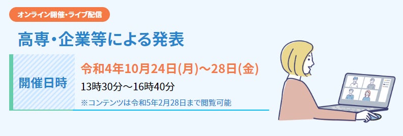 独立行政法人国立高等専門学校機構(東京都八王子市、理事長:谷口功)は、高専と企業・団体等とのマッチングを目的としたイベント「KOSEN EXPO 2022(コウセン エキスポ 2022)」を、10月24日(月)~28日(金)の各日午後にライブ配信します。