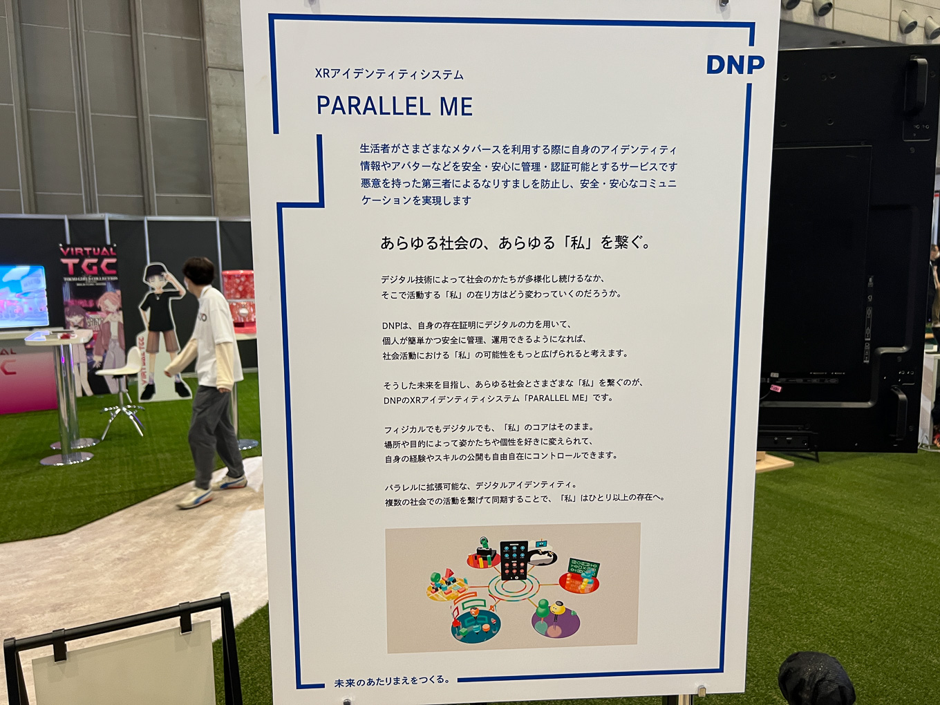 大日本印刷では、バーチャル空間を活用してリアルタイムに映像をつくれる「バーチャルプロダクション」が、展示サイズで目を引いていたが、新要素としてはXRアイデンティティシステム「PARALLEL ME」を発表していた(ニュース記事)。