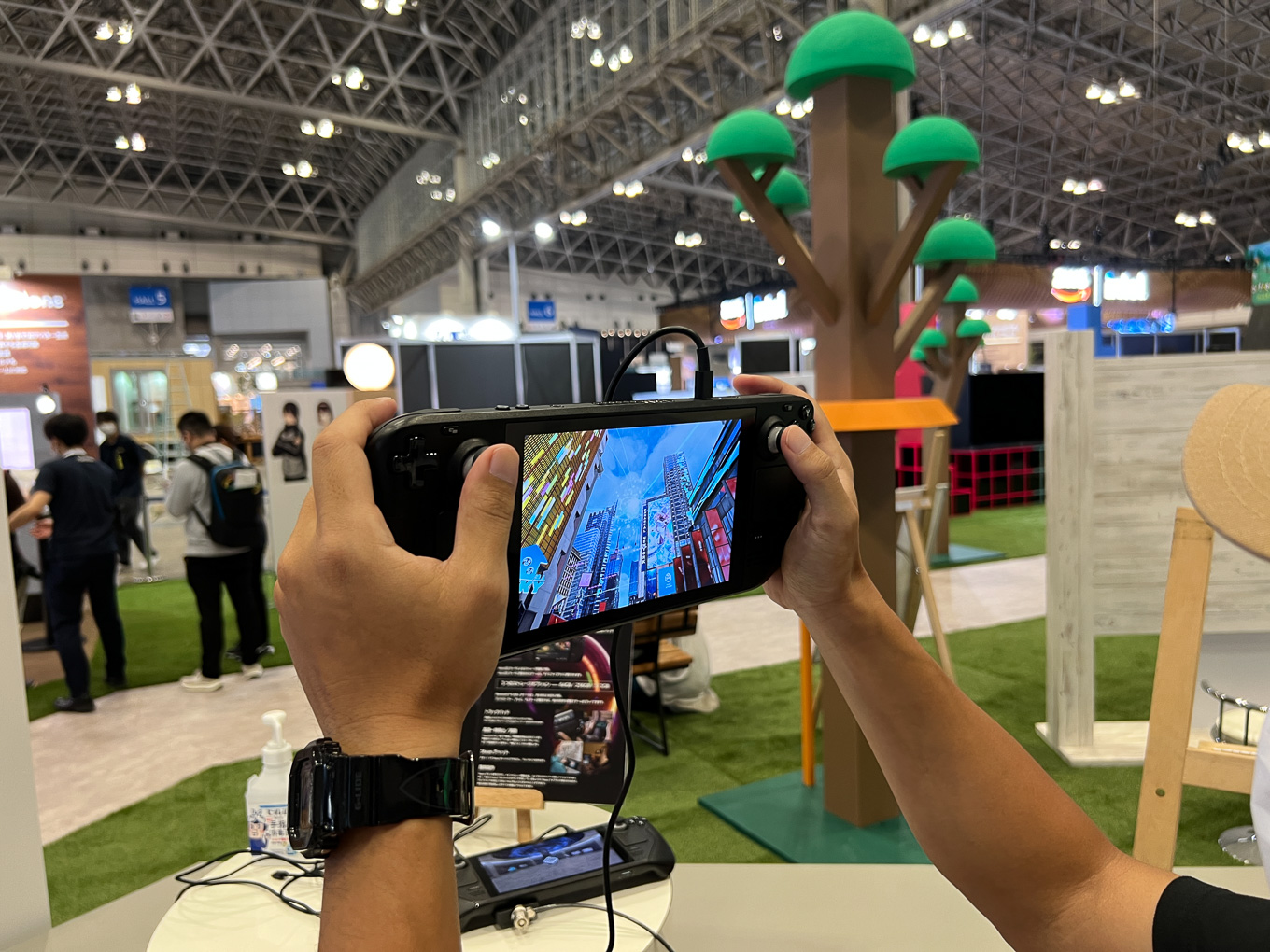 ガジェット好きにとっては、携帯型のゲーミングPC「Steam Deck」(スチームデック)や、スマホに繋いで使うARグラス「Nreal Air」にて、バーチャルマーケットを体験できるというデモが興味を引くはずだ。