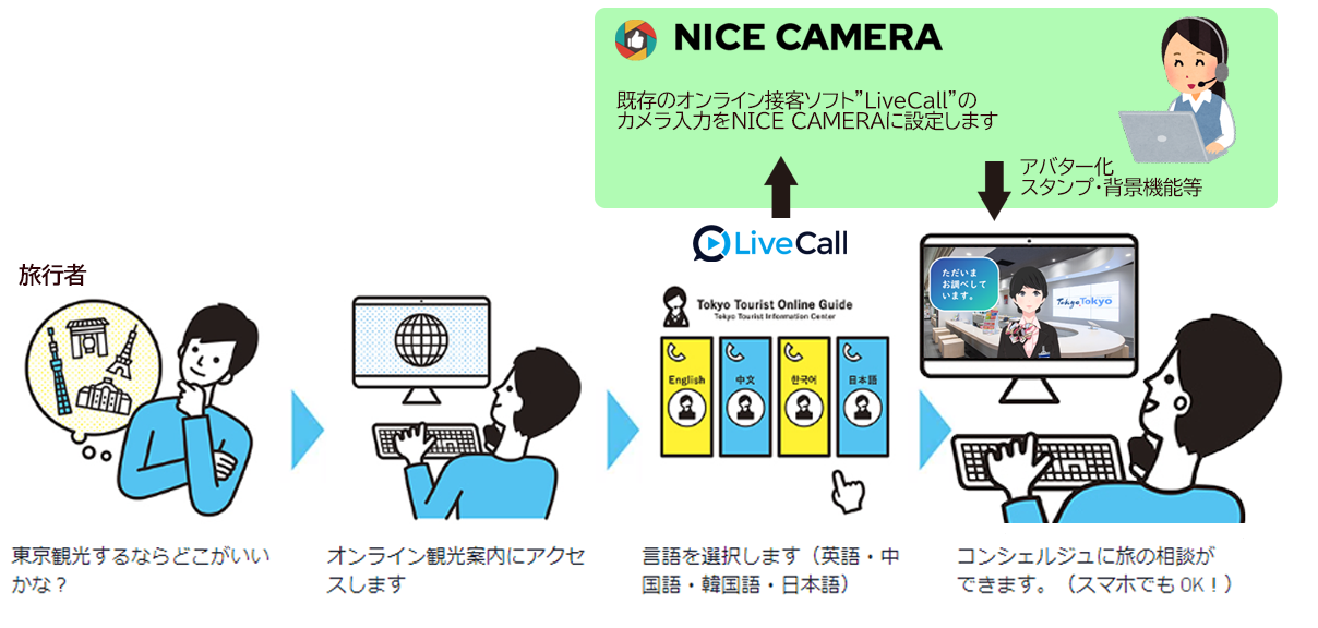 オンライン観光案内の仕組みとして既に導入されているオンライン接客ソフト「LiveCall」のカメラ選択を、本人を映すWEBカメラではなく、事前にインストールしておいた仮想カメラアプリケーションソフトである自社サービス「NICE CAMERA(ナイスカメラ)」に切り替えるだけで、利用者の画面にアバターを映し出すことができます。