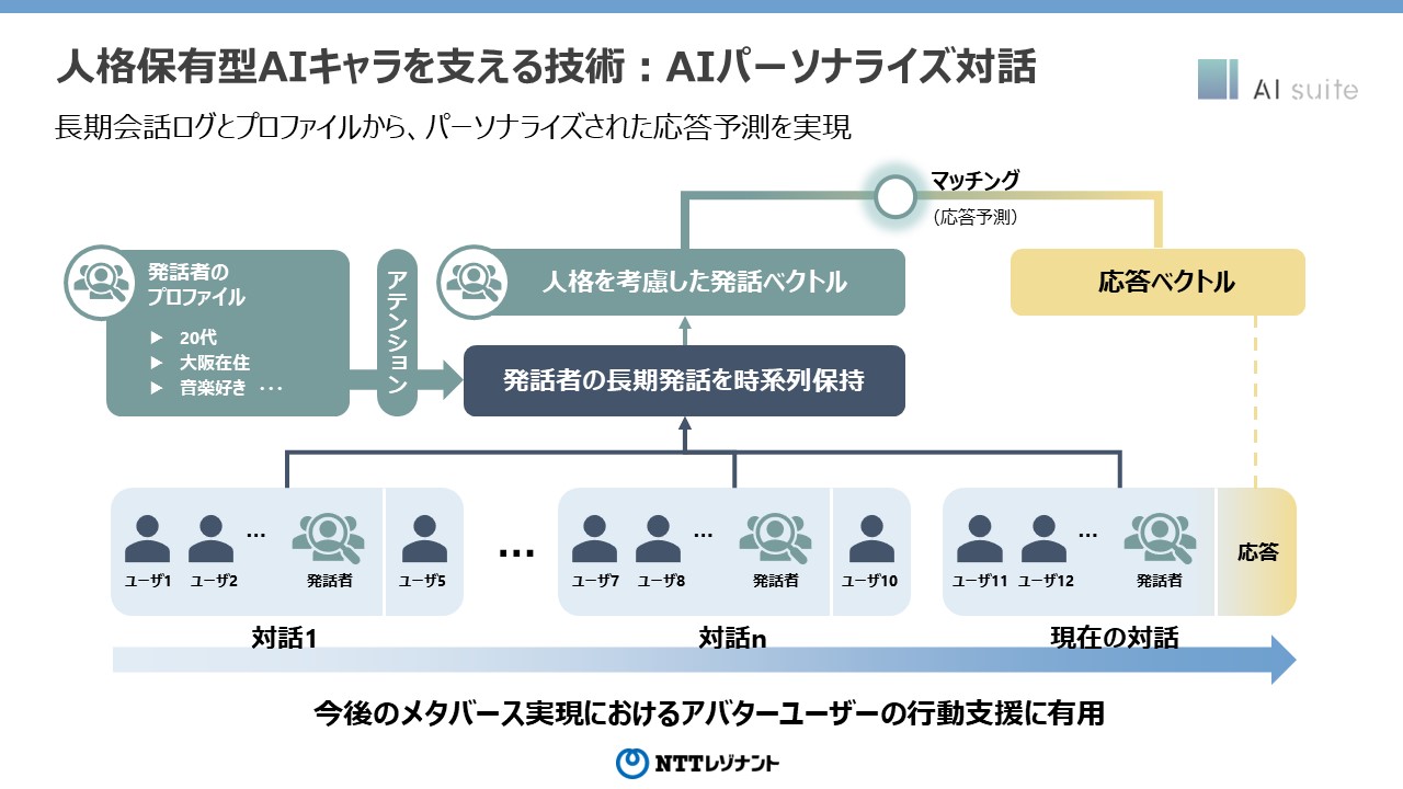 具体的には、「過去のn回分の対話」と、年齢・居住地・趣味嗜好といった「発話者のプロファイル」を考慮して、話し手の人格を読み取って応答している。これにより、ユーザーIDをもとに人格を学習したり、人格情報を記載した定型文を参照する従来の方法に比べて、人格や関係性を考慮した高精度な会話を実現してくれるという。