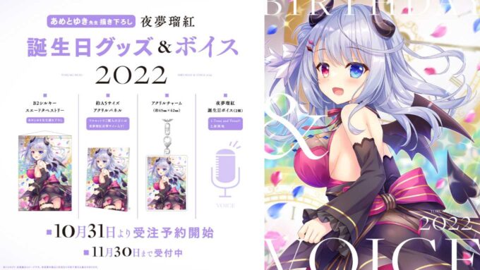 グッズは、あめとゆき先生の描きおろしB2シルキースエードタペストリーや約A5サイズのアクリルパネル 、アクリルチャームなどで、セットにも含まれる予定だ。 誕生日ボイス は「Treat and Treat!!」、「遊園地」とそれぞれ題された2種類あり、どちらも音声ファイルは、mp3とwavの形式になっている。フルセット購入者には、アクリルパネルに夜夢瑠紅直筆サインが記入される。