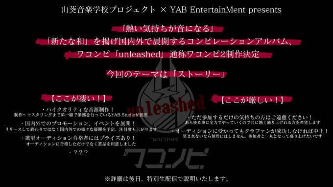 本アルバムの制作自体は9月に発表され、同時にアルバム参加のVTuberシンガー、イラストレーターのオーディションが行われていた。現在は、YAB EntertainMent合同会社取締役兼、音楽家のヘットフィールド師匠枠など、一部のメンバーをシークレットにした状態で参加者の公開がされている。