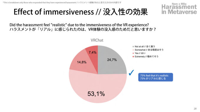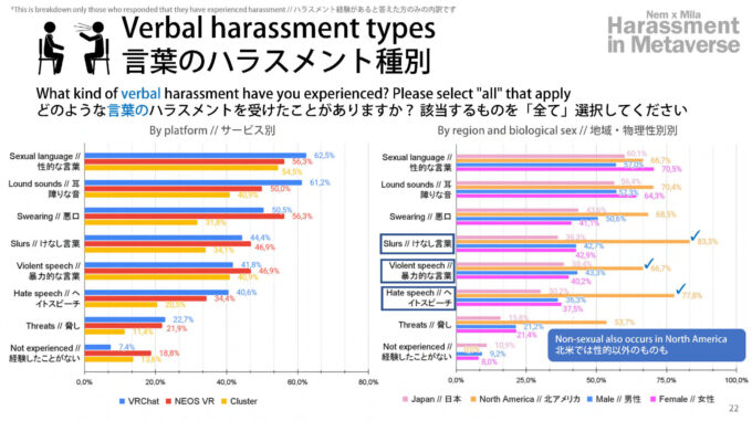 VRならではのハラスメントの種類、強度・経験率・物理世界とメタバース双方の生活に与える影響、法律やプラットフォームへのユーザー要望などの項目でまとめている。さらに、同じチームが実施した生活実態調査「ソーシャルVR国勢調査2021」と比べたユーザー動向の変化にも言及している。以下が一部のスライドだ。