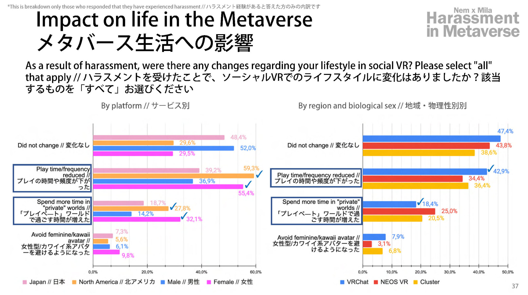 メタバースでのハラスメントは存在し、半数のユーザーが経験している。VRの没入性により、ユーザーはハラスメントを「リアル」に感じている。性的ハラスメントが最も多い。女性型アバターにより物理男性も被害に会いやすくなるなど、メタバース特有の特徴も見られる。程度としては「軽い」「中程度」がほとんどだが、状況やユーザーの特性(セクシャリティ・マイノリティなど)によっては「極めて重大」なものにもなりうる。物理現実世界と同様、お互いに思いやりを持ち、相手の立場に立って考え行動することが何より大事である。法律やプラットフォーマーに対しては、多くのユーザーがメタバースの自由に制限が加えられることに大きな懸念を持っていた。一方で、より柔軟な安全コントロールやガイドライン・モデレーションの充実を求める声も多かった。