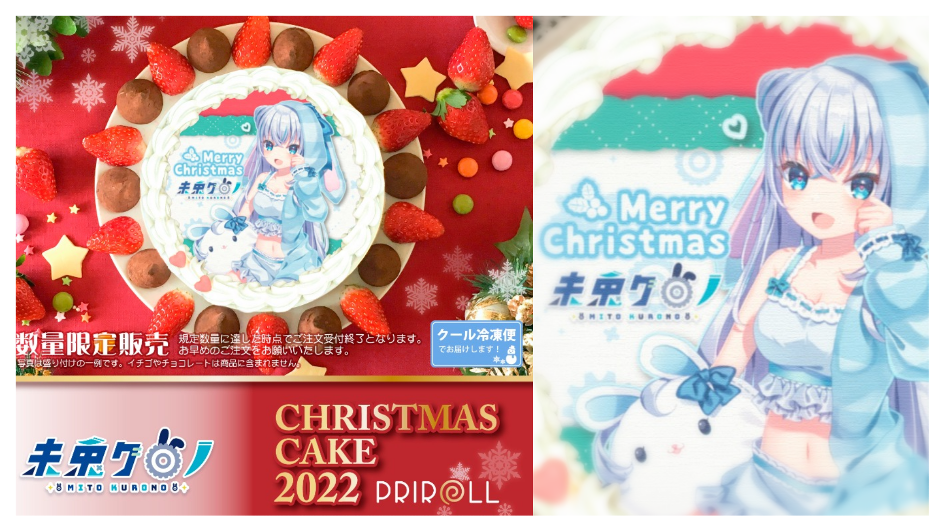 Liv-erseは8日、同グループの1期生である未兎クロノさんをあしらったクリスマスケーキを、プリロールにて数量限定で発売することを発表した。価格は5508円。11月14日まで予約すると5%オフの5233円となる。ケーキのサイズは5号(直径15cm、高さ7cm)。購入特典としてバッジが付属する。