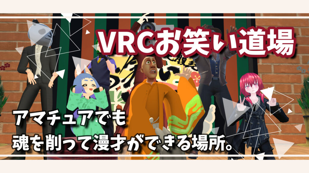 VRCお笑い道場は、2020年3月から活動を始め、自分たちでバーチャル劇場を作って芸を披露しており、ネタも自作だ。現在はメインで活動しているのが15名ほどで、お笑い道場には所属せずにフリーで参加する芸人もいる。観劇側は、話したりコミュニティを作ったりする必要がないため、VRChatを始めたばかりで何をしたらいいかわからない人でも、まず気軽に参加してもらえるようなイベントにしたいと言う。