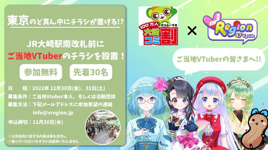 申し込み締め切りは11月30日、チラシ納品は12月23日必着で、参加費は無料だ。先着30名となっており、応募はご当地VTuber本人か活動団体に限られている。