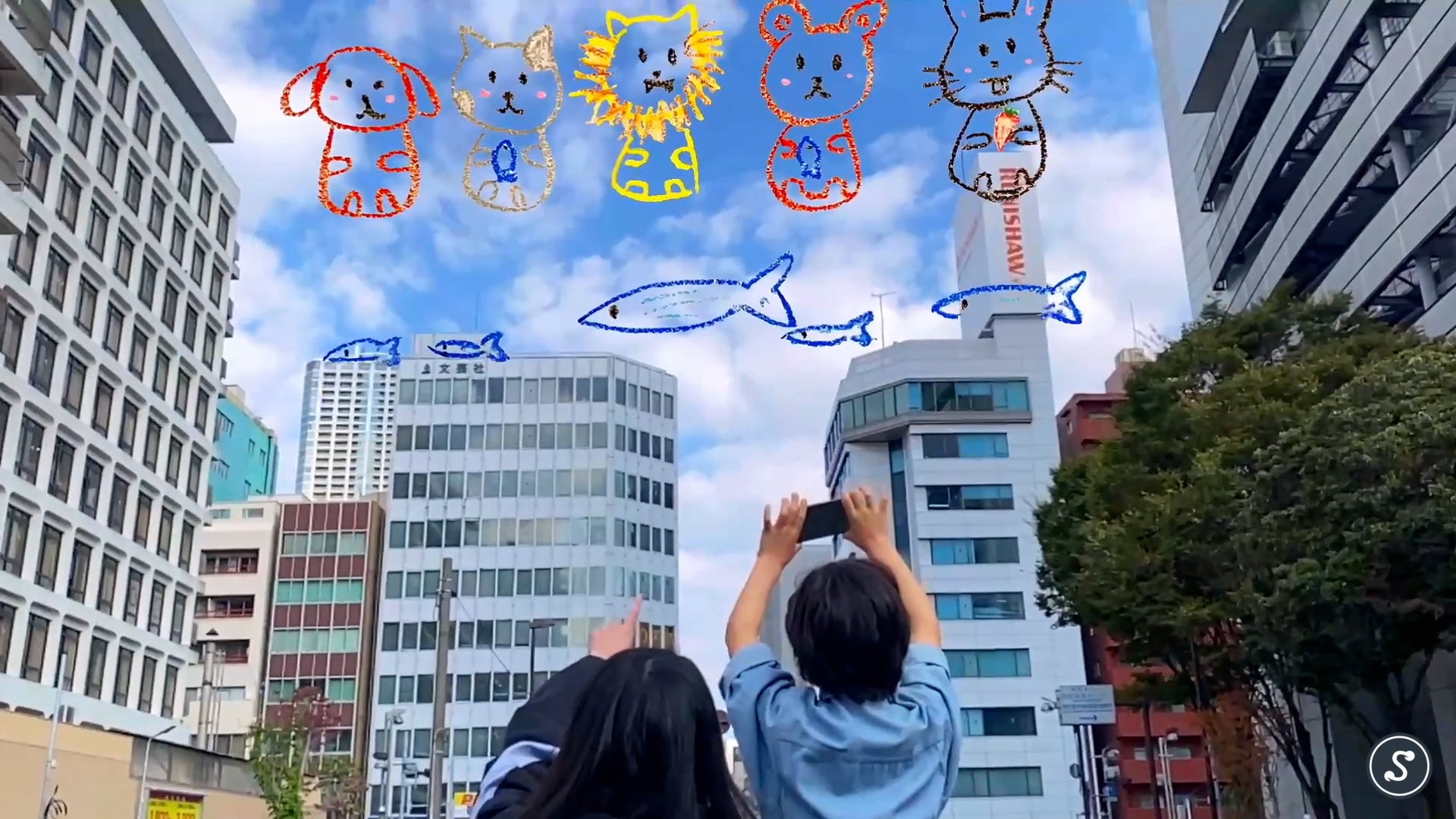 4.スマートフォンを空にかざすと、空に自分の描いたイラストが浮かびます。