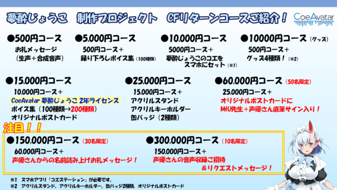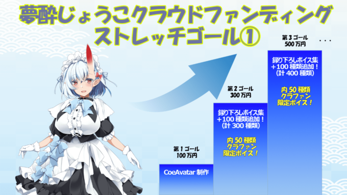 エイベックスの子会社・コエステは12月8日、個人ユーザー向け合成音声コンテンツの作成・編集ツール・CoeAvatar(コエアバター)のオリジナルキャラクター「夢酔じょうこ」(むすいじょうこ)制作プロジェクトのクラウドファンディングで、第一目標額を達成、ストレッチゴールを設定したと発表した。クラウドファンディングは、「GREENFUNDING」にて、11月25日~12月25日に実施されている。また、声優は久保田未夢が担当することが公開された。