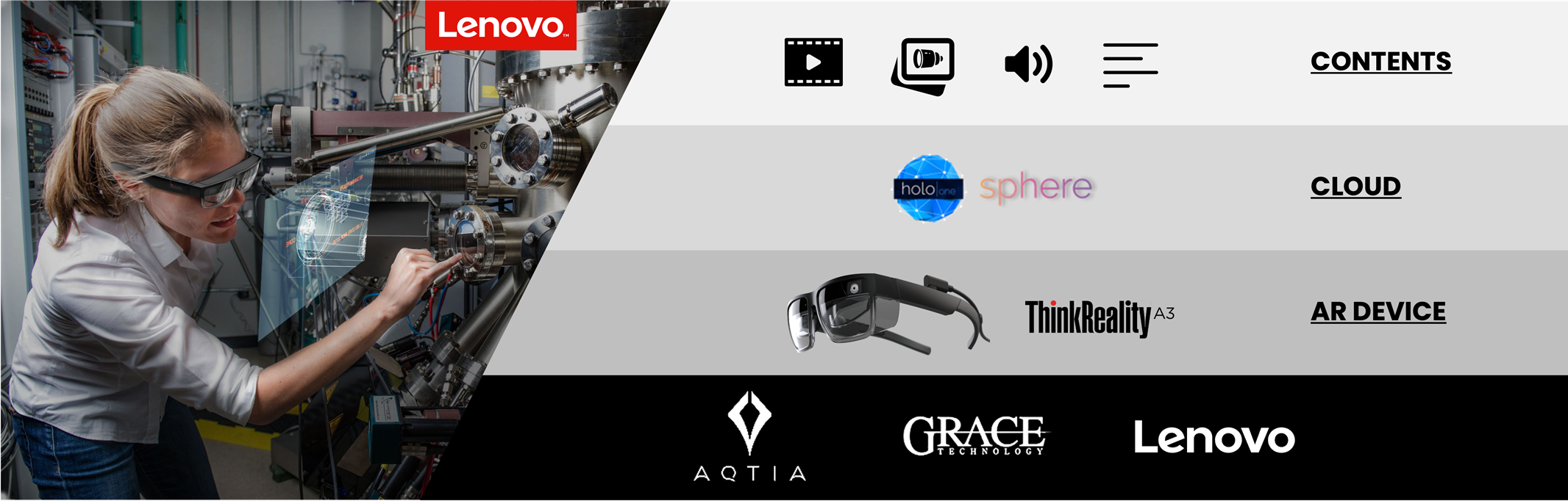 レノボ・ジャパン合同会社(本社東京都千代田区、代表取締役社長 檜山 太郎、以下レノボ)はレノボが販売するARソリューションセット「ThinkReality A3 Industrial Edition」の作業手順支援・遠隔エキスパートソリューション「holo one sphere」のエンドユーザーへの導入支援において、新規事業創出における事業立ち上げに係る企画・開発・オペレーション業務のアクティア株式会社(本社:東京都、代表取締役 北野 幸雄、以下アクティア)と、国内初の“マニュアル制作専門会社”グレイステクノロジー株式会社(本社:東京都、代表取締役 大池 信之、以下グレイステクノロジー)との3社協業を進めることを発表しました。レノボのARソリューション、グレイステクノロジーのマニュアル制作ノウハウ、アクティアの先端テクノロジーを実サービスに活用するノウハウを活かし、エンドユーザーの業務効率を上げるためのARマニュアル導入を支援します。