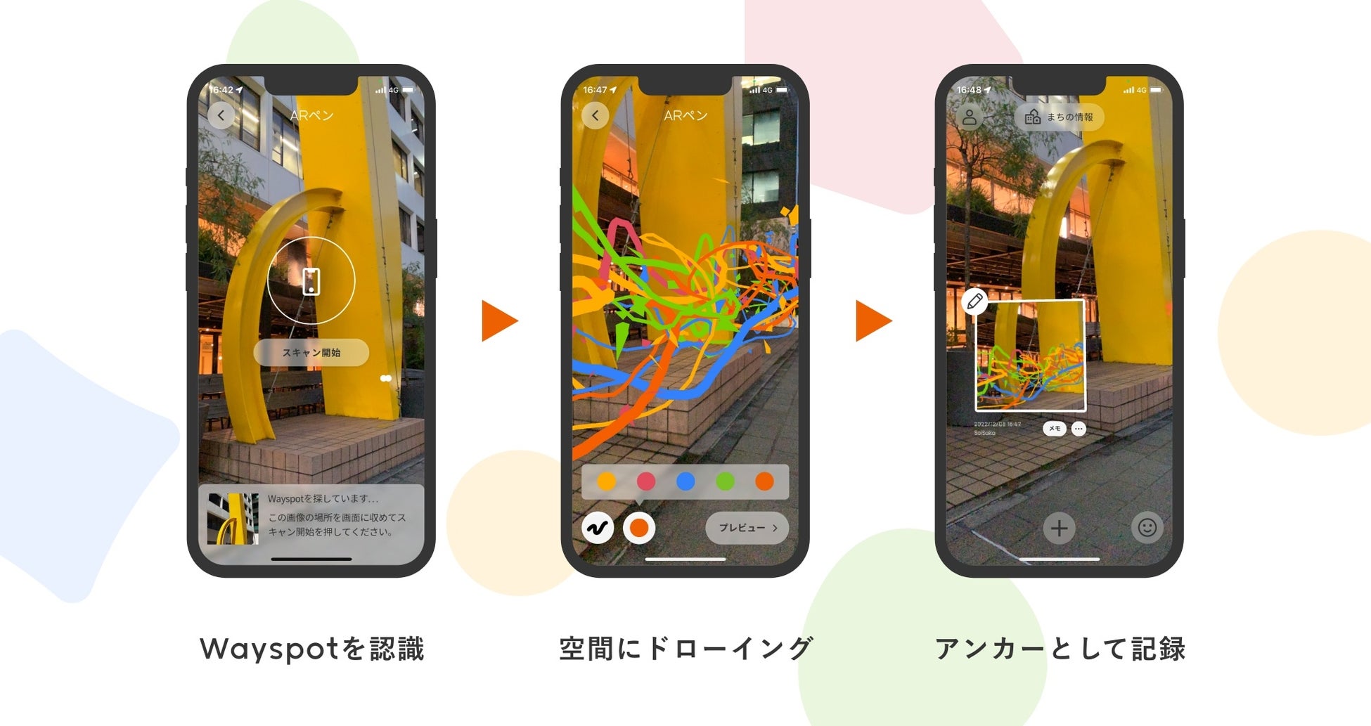 Niantic社が提供する「Lightship VPS(※7)」を活用し、街中にあるWayspotを認識すると空間にドローイングが可能です。それをアンカーとして記録することで、同じ場所に訪れた他のユーザーもセンチメートル単位で同期したドローイングを見ることが可能です。