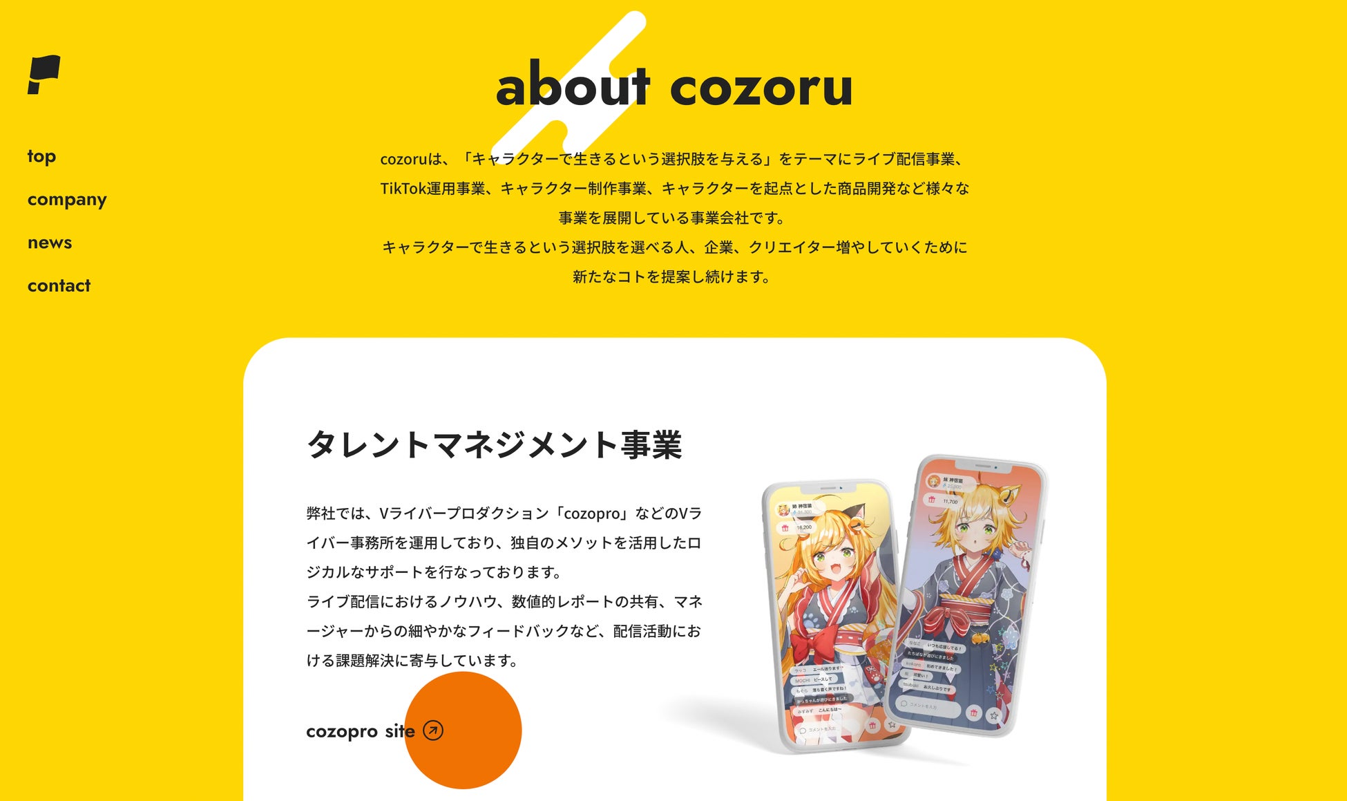 株式会社cozoruは、「Characterと共に生きれる人を増やし続ける」をvisionに、バーチャルライバーのマネジメントを行なっているタレント事務所になります。