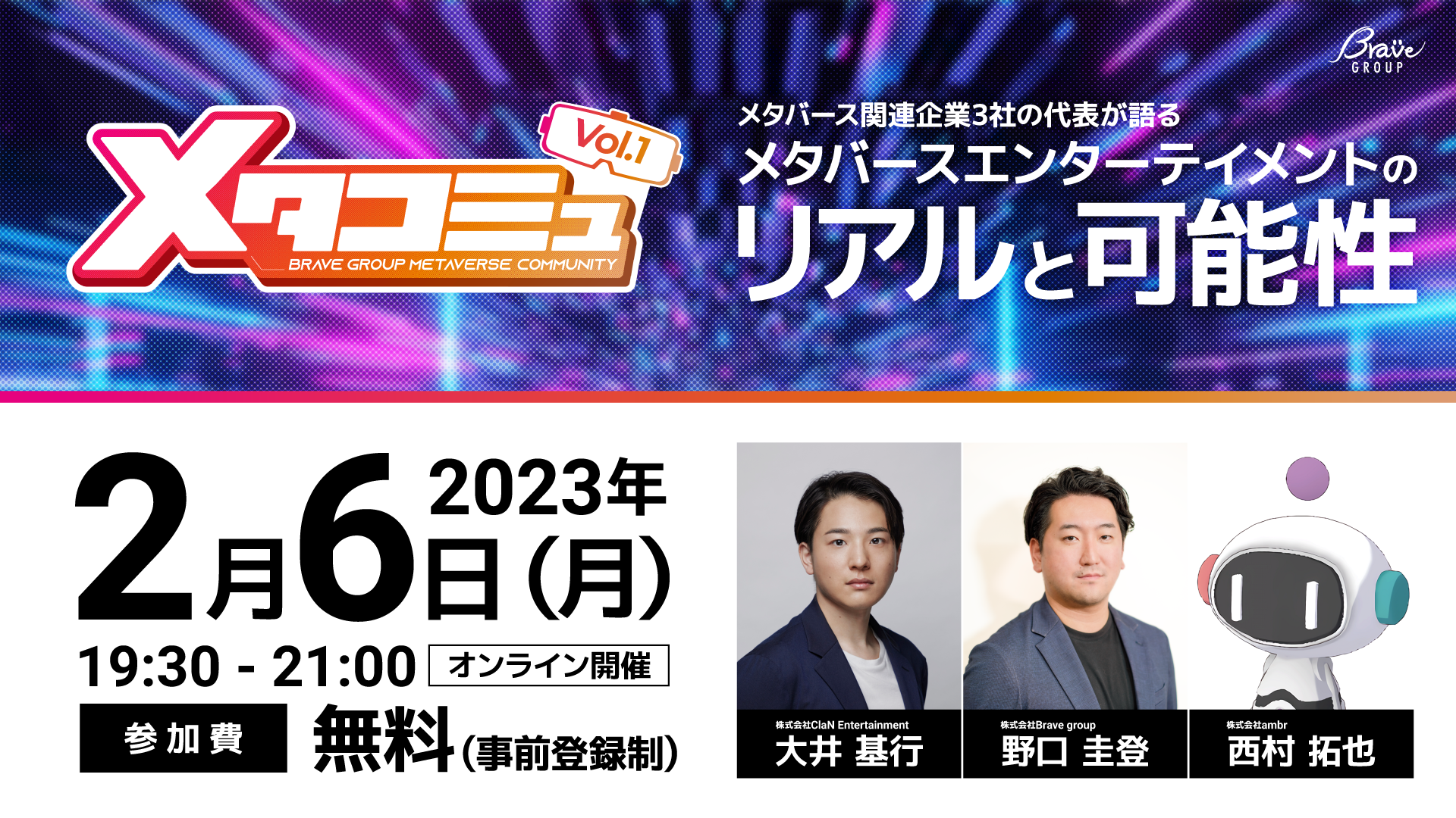 メタバース領域で様々な事業を展開する株式会社Brave group(本社:東京都港区、代表取締役:野口圭登、読み:ブレイブグループ、以下「Brave group」)は、メタバースを語る定期イベント「メタコミュ」を発足し、第1回目のウェビナーを2023年2月6日(月)に開催することをお知らせいたします。