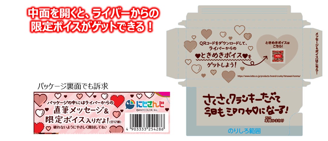 クランキーで初となるVTuberとのコラボとなる本商品では、12人のライバーがそれぞれのパッケージに登場するほか、『クランキー にじさんじデザイン』では、中面を開くとライバーの直筆メッセージが現れたり、QRコードから限定ボイスをゲットできたりします。また、『クランキーポップジョイ にじさんじデザイン』のパッケージは、特別な描きおろしデザインです。
