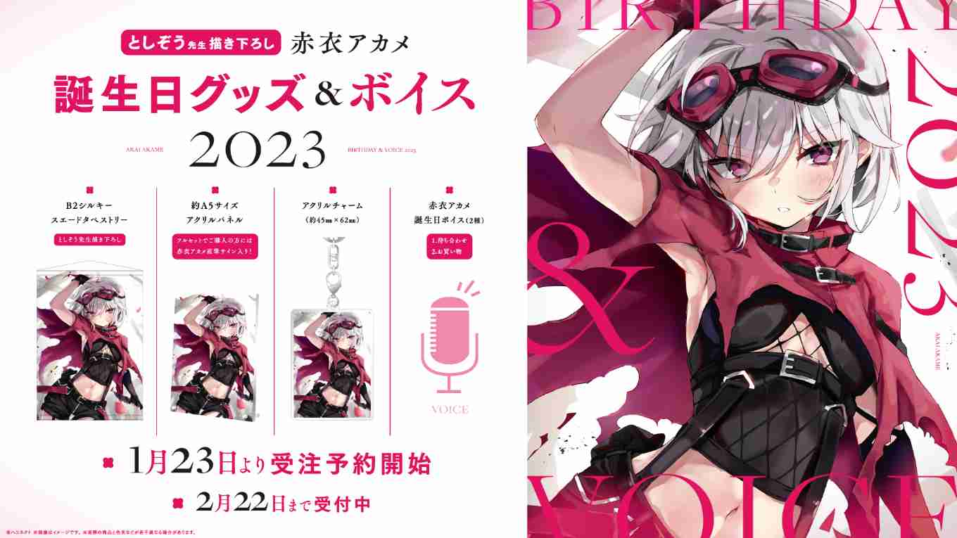 グッズは、としぞう先生の描きおろしB2シルキースエードタペストリーや約A5サイズのアクリルパネル 、アクリルチャームなどで、セットにも含まれる予定だ。 誕生日ボイス は「待ち合わせ」、「お買い物」とそれぞれ題された2種類あり、どちらも音声ファイルは、mp3とwavの形式になっている。フルセット購入者には、アクリルパネルに赤衣アカメ直筆サインが記入される。