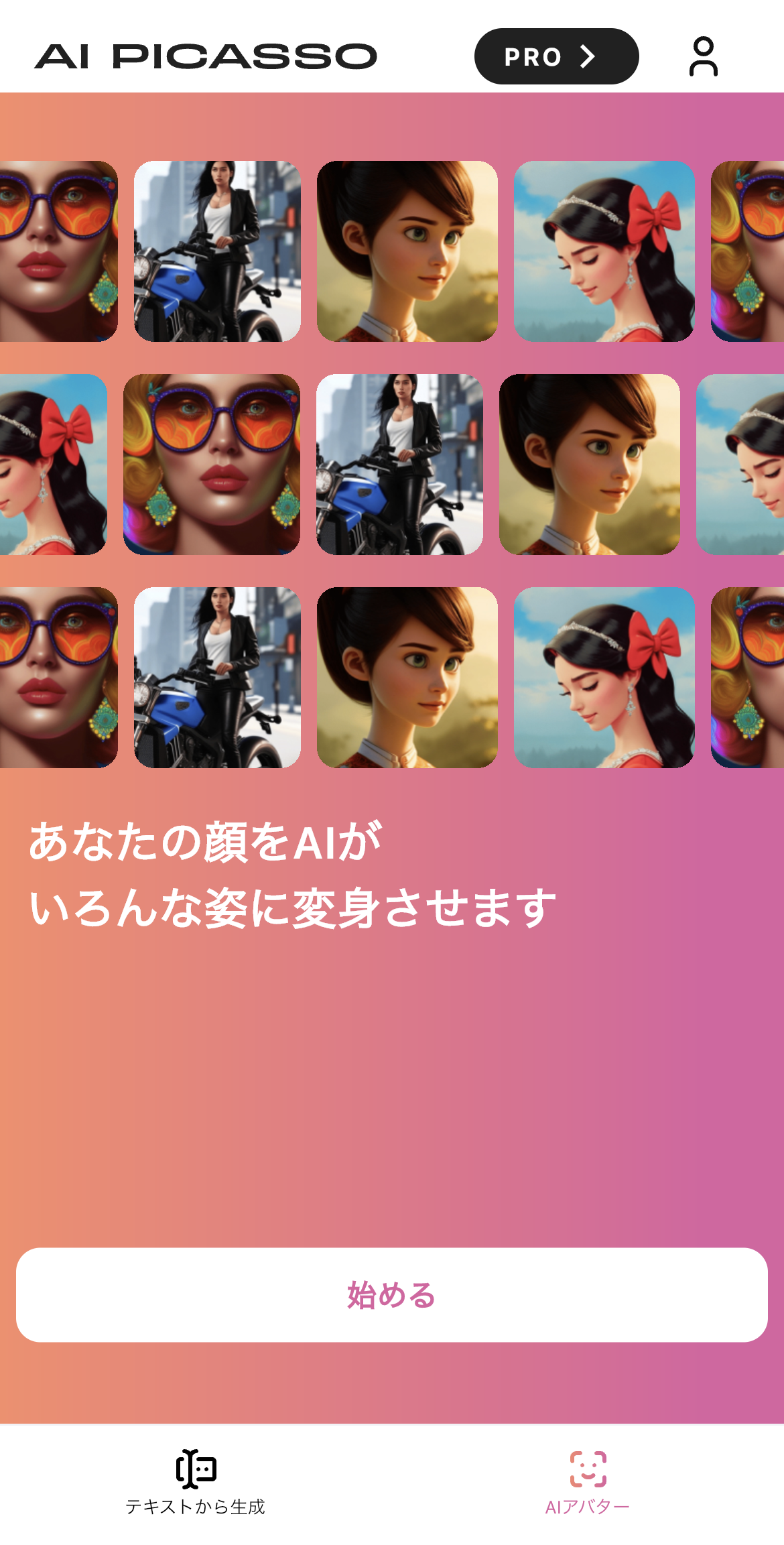 アプリを起動後、「AIアバターで似顔絵を作る」のバナーをタップ or アプリ下部にある「AIアバター」を選択