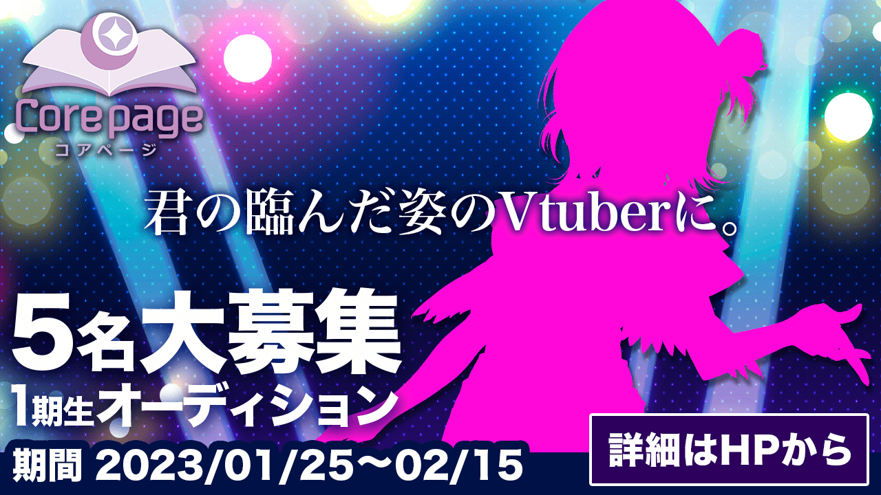 女性Vtuberグループ「Core page-コアページ-」からデビューする1期生メンバー5名の募集が、1月25日~2月15日の期間で開始された。オーディション合格後は、運営と共に「成りたいVtuber像」に合わせたデザインやイラストレーターの選定をしていくと言う。モデル作成中は、Vtuberやタレントとしての基本スキルを身に着けるため、無料の研修期間が設けられている。