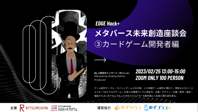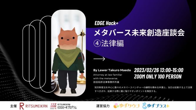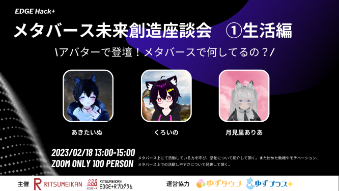 立命館大学 EDGE+Rプログラムは2月14日、「仮想世界で生活!?今話題のメタバースを知り尽くす4日間 メタバース未来創造座談会 」を2月18 、19、25、26日の4日間、zoomにて開催すると発表した。 メタバースを数百時間プレイする「メタバース活動家」や、メタバース上で起業している人、メタバース法律家などを招く予定で、 学生だけではなく、一般からの参加も可能となっている。