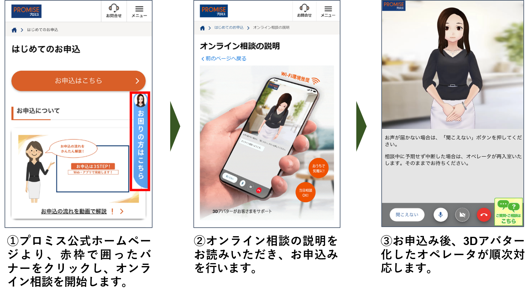 SMBCコンシューマーファイナンス株式会社(代表取締役社長:金子 良平 以下、当社)が展開するプロミスは、2023年2月27日(月)より、Webからお申込みいただく新規のお客さま向けに、3Dアバターを活用した「オンライン相談」サービスを開始いたしました。オペレータの声や動作を連動させた3Dアバターがお客さま対応を行うことで、Web申込みの手続き操作やお借入れに対する不安解消につなげるなど、シームレスで安心したお申込みが可能となります。1.サービスの概要