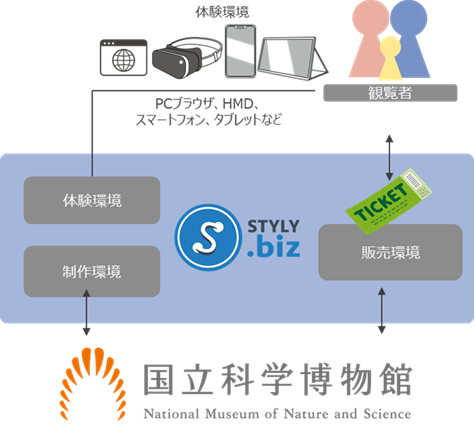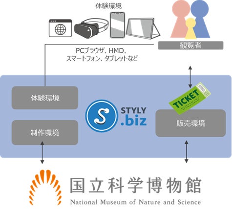 「STYLY.biz」は、ご家庭にあるPCブラウザやスマートフォン・タブレットなどから簡単に体験することができます。また、各種の展示空間を製作するための2種類の制作ツールや様々なイメージテンプレートを備えていて、さらに有料イベントのチケット販売と連携することができます。体験・制作・販売をオールインワンで提供するサービスとなっており、国立科学博物館の提供するバーチャル空間体験を強力にサポートしていきます。