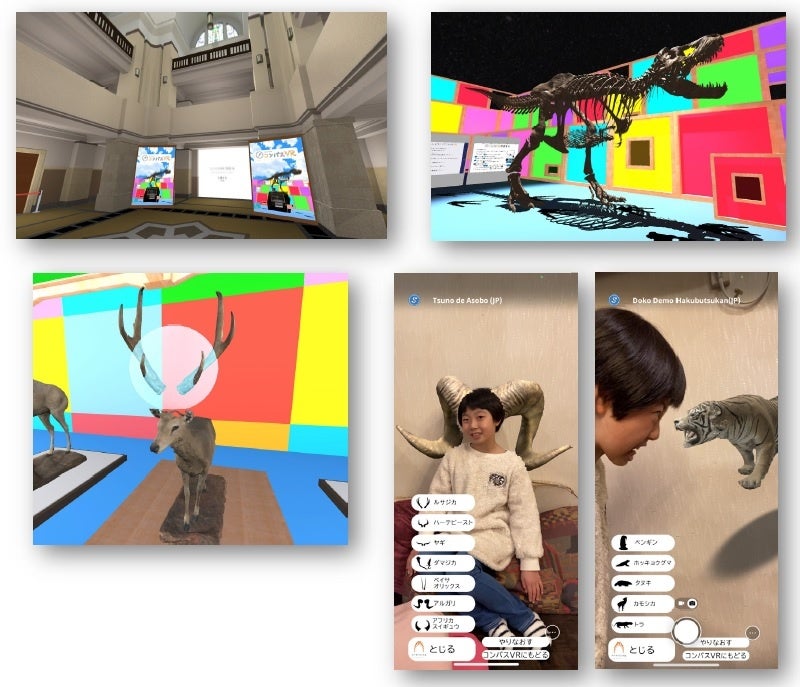 東京・上野公園にある国立科学博物館のシンボルで、国指定の重要文化財である日本館をバーチャル空間上につくり、そこを入り口として「たんけんひろば コンパスVR」に移動することができます。ティラノサウルスの全身骨格やニホンカモシカのはく製など「親と子のたんけんひろば コンパス」に展示してある標本だけでなく、収蔵庫に保管されていて通常は公開されていない標本についても、様々な角度から観察したり、手に取るように間近で見たりすることができます。これらを用いて、空間内に隠された標本を見つけて並べ替える「動物ならべ」や、ウシやシカの仲間のツノと体を正しく組み合わせて展示を完成させる「このツノだれの?」といった体験メニューもあります。