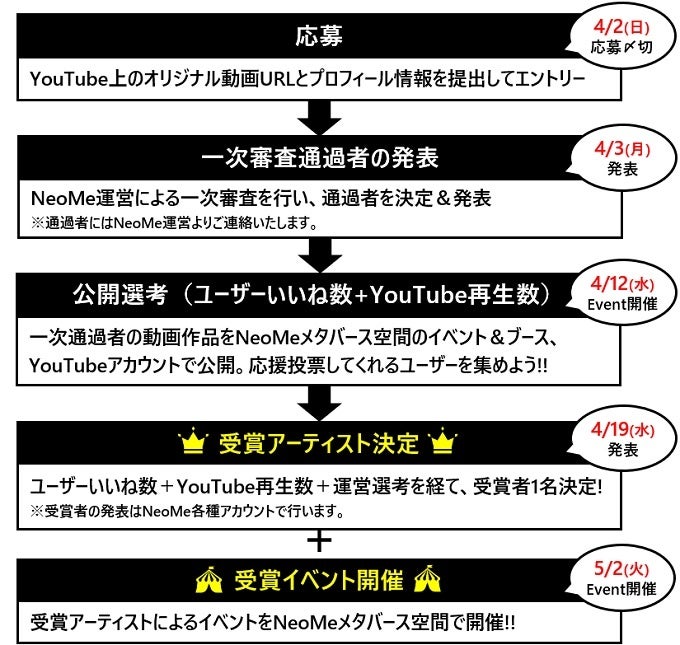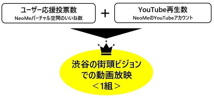 応募いただくYouTube動画での一次選考を経て、通過者の動画作品をNeoMeメタバース空間内の告知ブースやユーザー参加イベント、YouTubeで公開します。ユーザーの応援数(いいね数)とYouTube再生数での公開選考で受賞者1組を決定。受賞者には渋谷街頭ビジョンでの動画作品放映を進呈します。