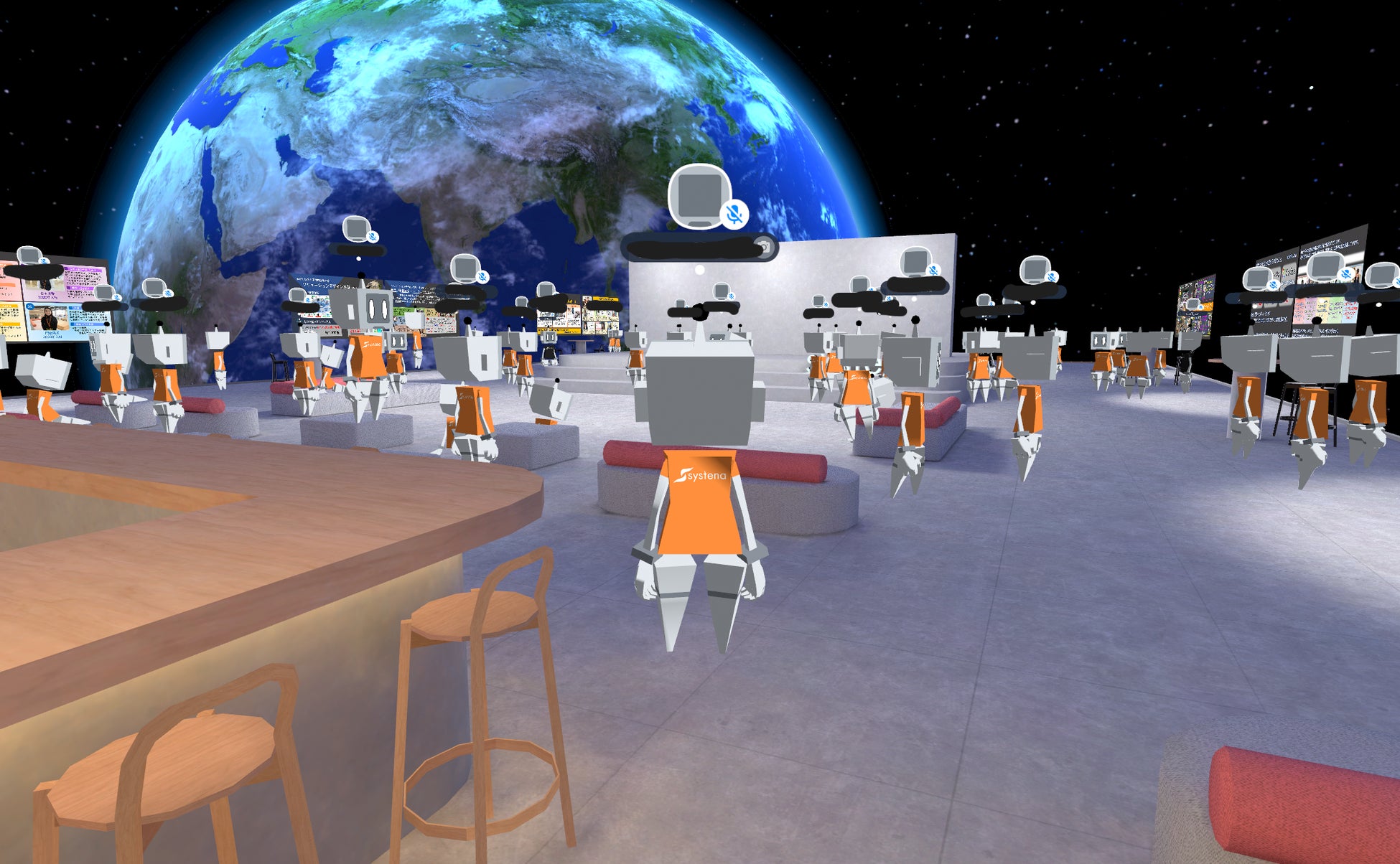 システナは本年度の入社式に関して、従来の新卒社員を大会場に一堂に集めて行う方式をやめ、全く新しい取り組みとして、本社内のカフェエリアにて体験型のリアル開催を行いながら、同時にメタバースプラットフォームを利用したバーチャル空間での開催も行う、「体験型リアル×バーチャル空間」のハイブリッド型入社式を開催しました。