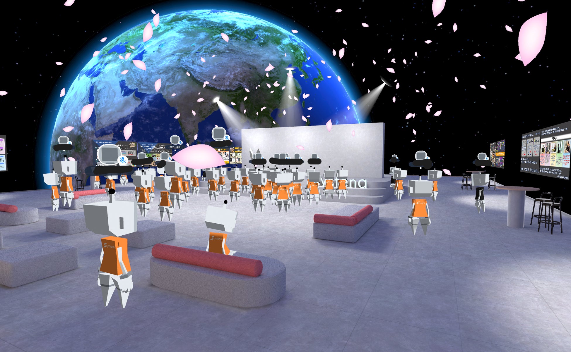 今回、メタバース空間は自社のカフェエリアを再現するだけでなく、それを宇宙空間の中に出現させ、そこに新入社員各々のアバターが集まり自由に歩き回りながら、自社のサービスを紹介する各事業部門のサインボードを博覧会のように見学できる演出としました。また、メタバース空間でありながら、経営陣の講話、先輩社員の祝辞、辞令交付などのセレモニーはアバター同士で行われ、リアル開催時そのままの体験がバーチャルでも再現できる形としました。