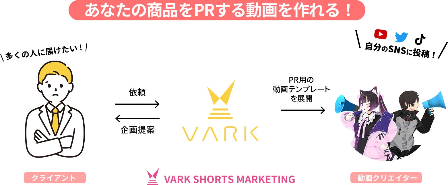 複数のエンターテイメントサービスを展開する株式会社VARK(本社:東京都豊島区 代表取締役:加藤卓也、以下VARK)は、10,000以上のクリエイター、動画総再生数1,000万回以上を記録する「VARK SHORTS」を活用した新しいSNSマーケティングサービス「VARK SHORTS MARKETING」の提供を本日5/26(金)から開始いたしました。