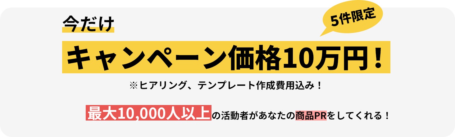 サービスの開始を記念し、お申込みいただいた中から5件限定で、キャンペーン価格10万円で本サービスをご利用いただけるキャンペーンを開催いたします。是非とも、この機会をお見逃しなく新しいSNSマーケティングをお試しください。
