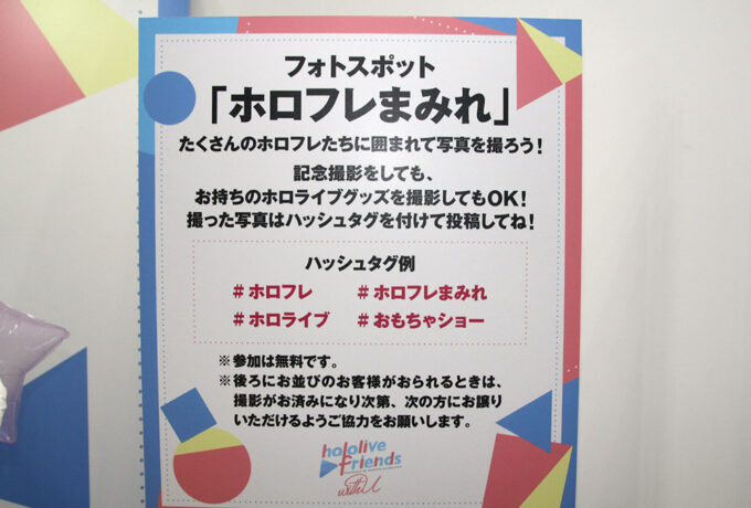 条件その2は、ブース内の「hololive friends with u」展示スペースを撮影し、自分のTwitterアカウントでハッシュタグ「#ホロフレ」を付けて投稿。その画面をブースにいるスタッフに提示すること。